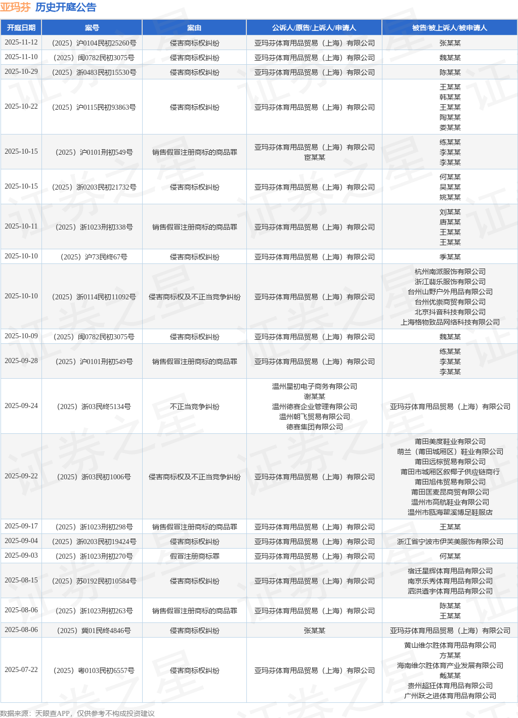 根据统计,近一年内以亚玛芬体育用品贸易(上海)有限公司为当事人的历史开庭公告有69则,其中案由为“侵害商标权纠纷”的公告以43则居首,其次为“销售假冒注册商标的商品罪”有6则,“假冒注册商标罪”有4则。历史开庭公告(前20条)如下: