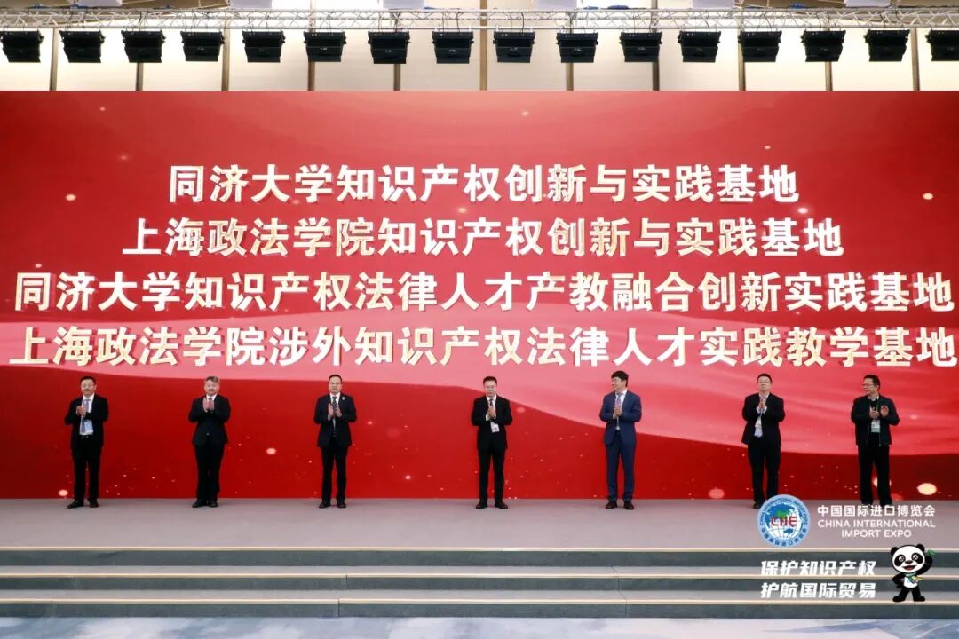 随后,与会领导共同为同济大学、上海政法学院在进博会和虹桥国际中央法务区设立的“知识产权创新实践基地”揭牌,标志着高校科研资源与进博会实践场景、虹桥国际中央法务区法律资源的深度融合,为复合型、应用型知识产权人才培养奠定基础。