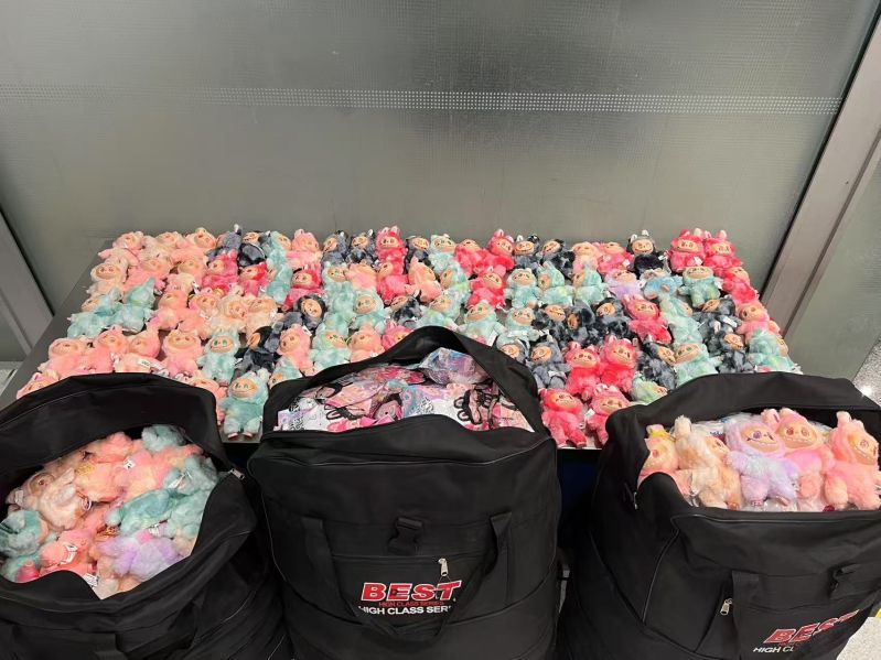 现场关员在对出境旅客行李物品进行监管时,发现多名旅客的行李中装有大量外观相似的玩偶,做工粗糙且包装简陋。经过仔细辨别,现场关员发现这些玩偶与“POP MART”品牌旗下名为“LABUBU”的玩偶高度相似,且均印有“POP MART”品牌标识,但印刷模糊。此外还发现印有相同品牌标识的卡片和包装盒。经清点,上述玩偶共7850件,卡片和包装盒共955件。现场关员初步判断存在较大侵权嫌疑。