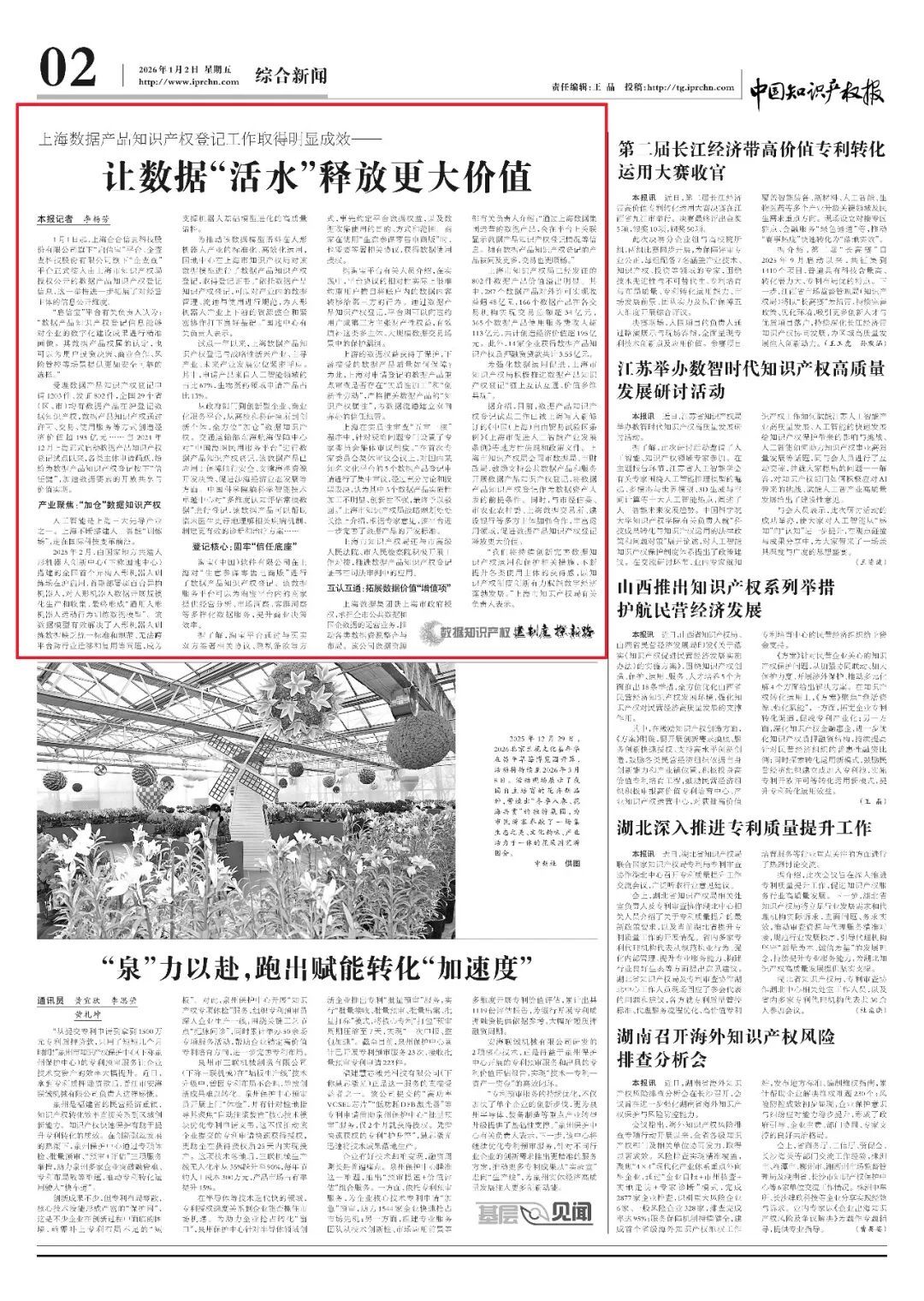 “我们将持续创新完善数据知识产权运用和保护相关措施,不断提升各类使用主体的获得感,以知识产权制度创新有力赋能数字经济蓬勃发展。”上海市知识产权局有关负责人表示。(本文刊于2026年1月2日《中国知识产权报》第02版综合新闻 记者:李杨芳)
