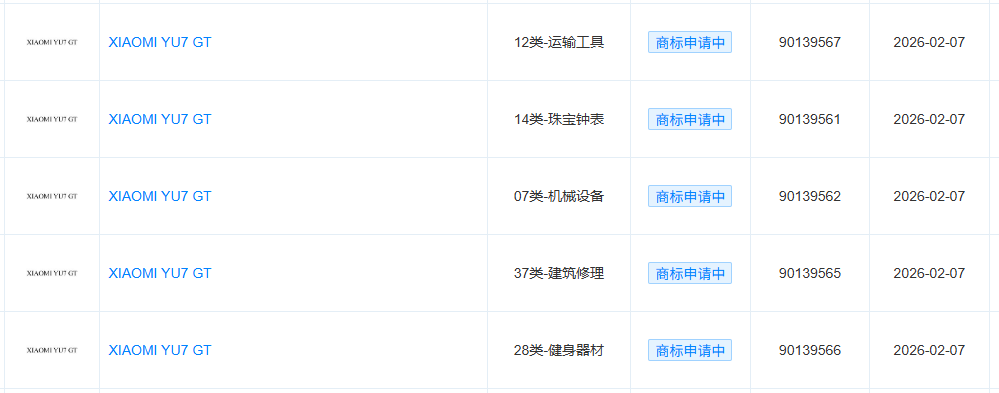 每经AI快讯,天眼查知识产权信息显示,近日,小米科技有限责任公司申请注册多枚“XIAOMI YU7 GT”商标,国际分类包括运输工具、珠宝钟表、机械设备等。