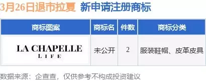 根据天眼查APP数据显示,近日上海拉夏贝尔服饰股份有限公司新提交“未公开”等2件商标注册申请。商标申请详情如下: